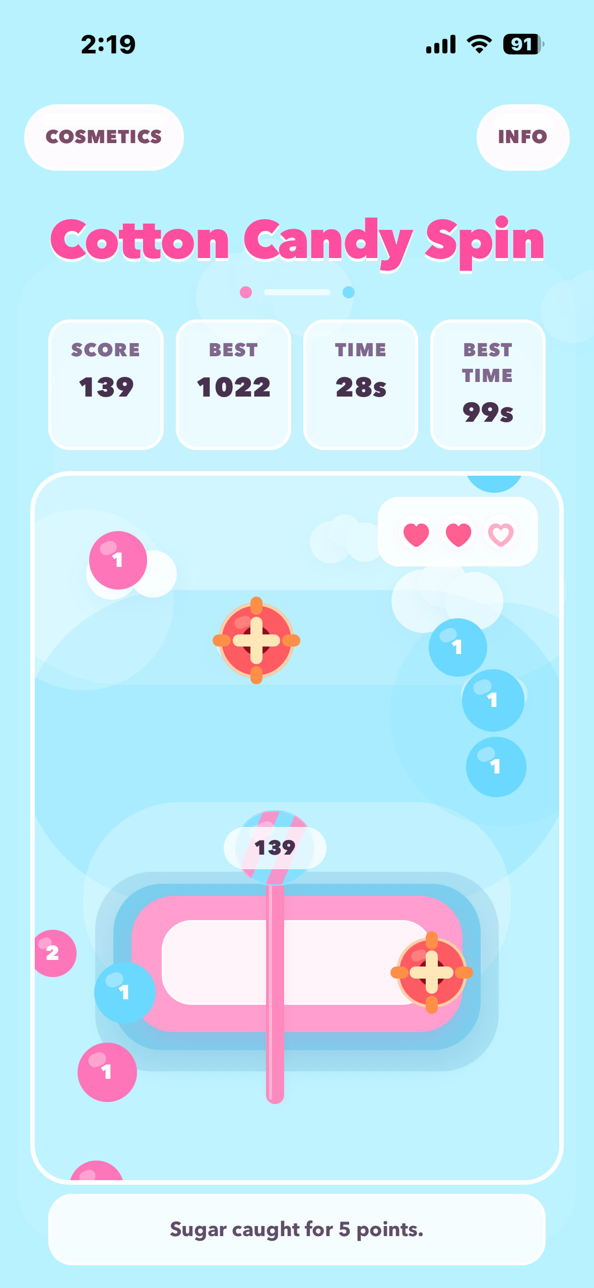 Cotton Candy Spin keeps the loop approachable while still giving players a few layers to master: contact timing, hazard avoidance, score milestones, and long-term cosmetic progression.